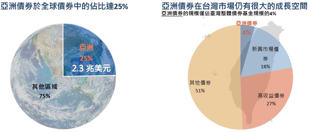 過往台灣投資人追逐的高配息標的多集中成熟國家的高收益債券上,忽略眼前其實也有不錯的收息標的-亞債。綜觀全球債券市場規模,亞洲債券規模佔全球債券約25%(約2.3兆美元) ,而台灣投資人在亞洲債券的投資規模,卻僅佔整體台灣債券市場規模的4%,從規模成長來看,台灣投資人投資亞債的比重至少得成長6倍,才能跟國際投資人一樣在債券資產的佈局比重持有相當分量。