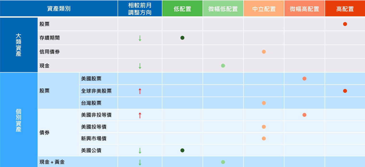 本月份大類資產同樣維持股優於債的配置建議,聯準會預防性降息有利於整體風險性資產評價,但基於利率不會有太多下行空間,債市我們相對更看好債息相對較高的信用債券。股票部分,由於美國降息可望帶動美元維持相對弱勢,對非美市場較為有利,因此我們再度上調非美股票的配置建議比重。