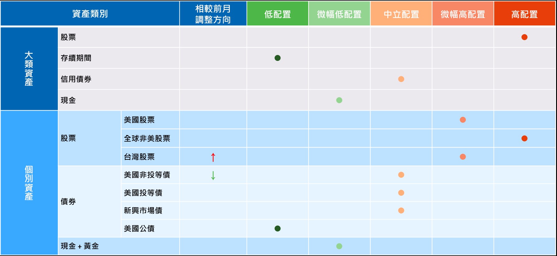 本月份大類資產同樣維持股優於債的配置建議,股市部分相對看好非美股市;其中台灣股市因2026企業營收與獲利預估均持續上調,惟成長主要仍集中在AI概念族群,可趁近期修正分批布局。預防性降息前題下,利率仍將呈區間整理,我們維持以債息相對較高的信用債券為主的配置觀點,但考量美國景氣可能趨緩,調降非投等債至中立建議。