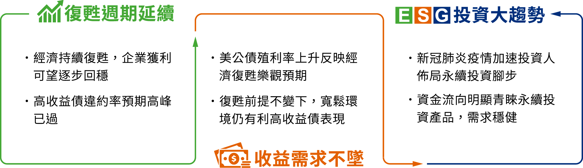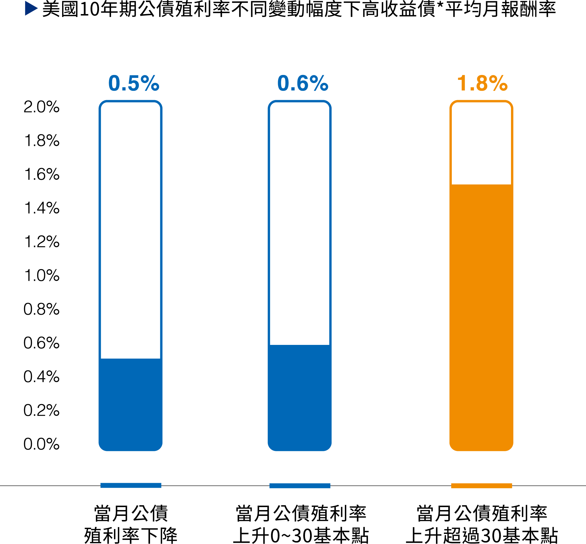 高收益債相對其他債券有高殖利率 + 高利差 + 較短存續期間特性,較不受公債殖利率上彈風險影響,甚至在公債殖利率上升幅度較高的月份平均表現佳。