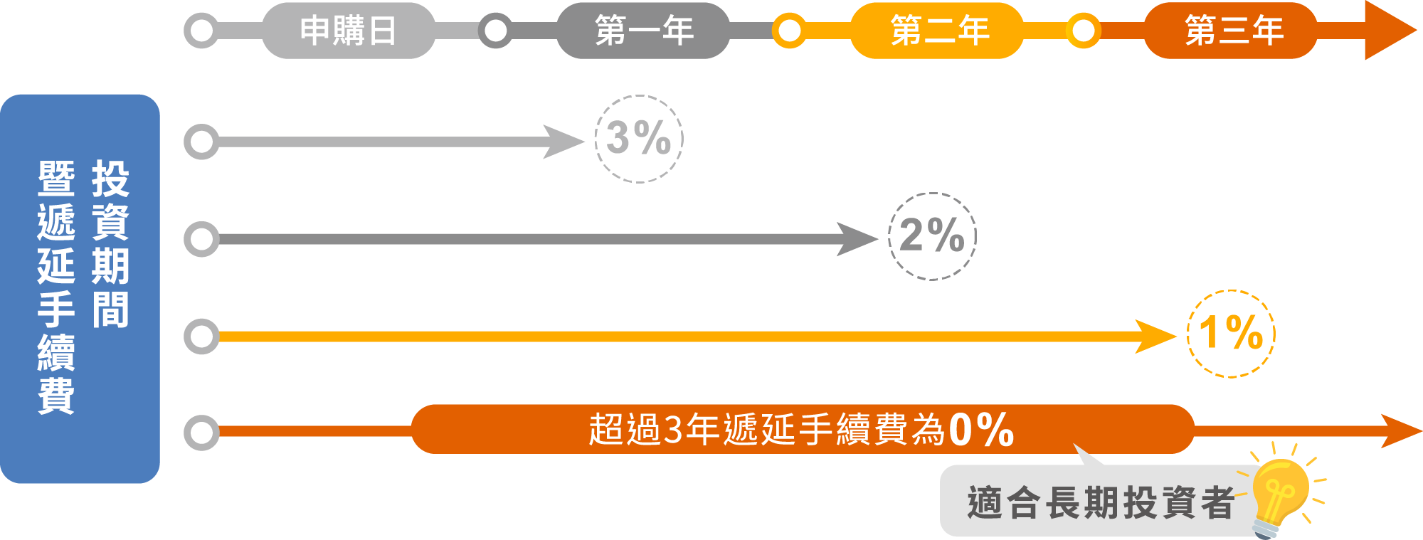 註:凱基投信N類型投資未達(含)1、2、3年,遞延手續費率分別為3%、2%、1%,於買回時計收,滿3年後即零申購手續費,且不收取分銷費,請詳參基金公開說明書。