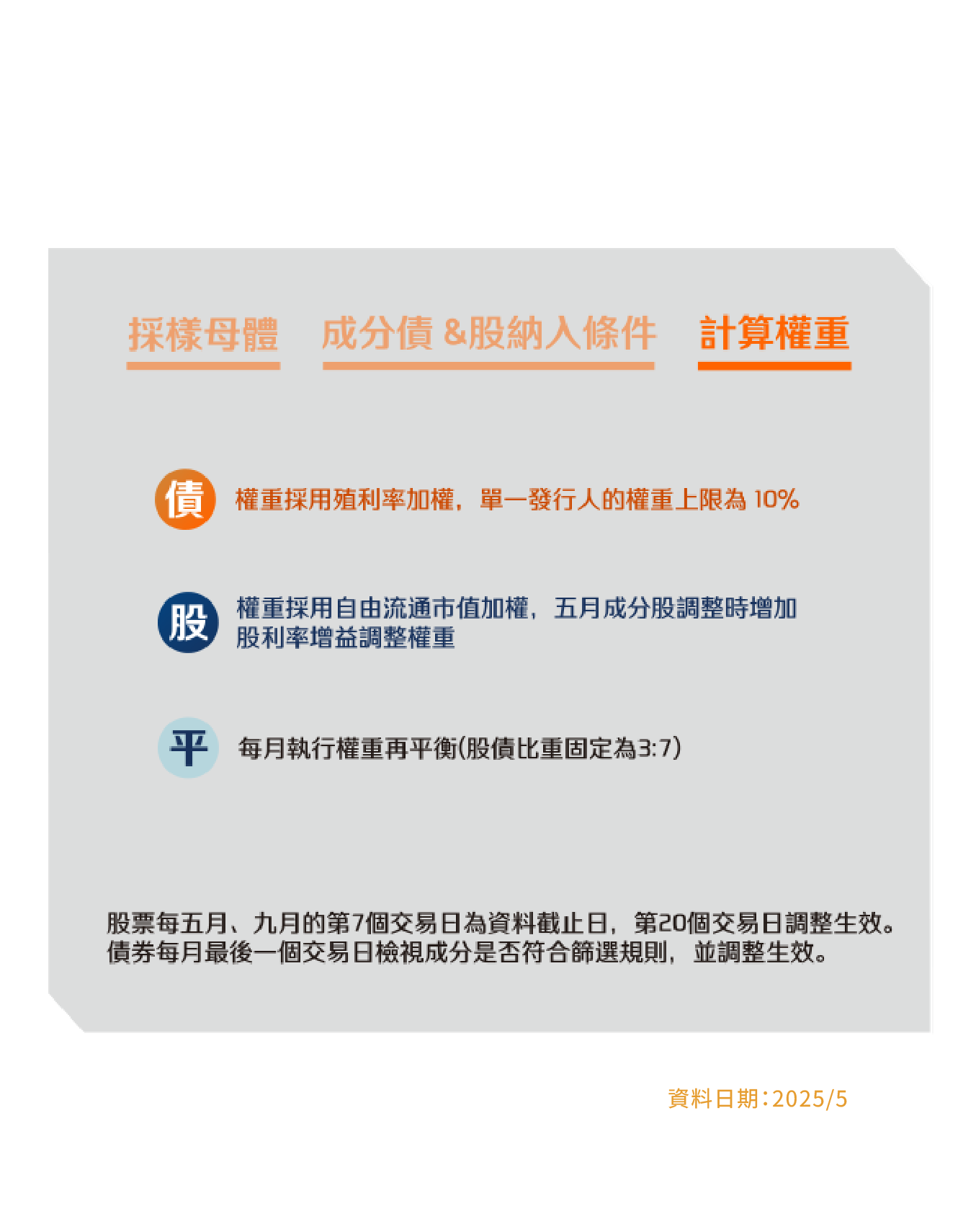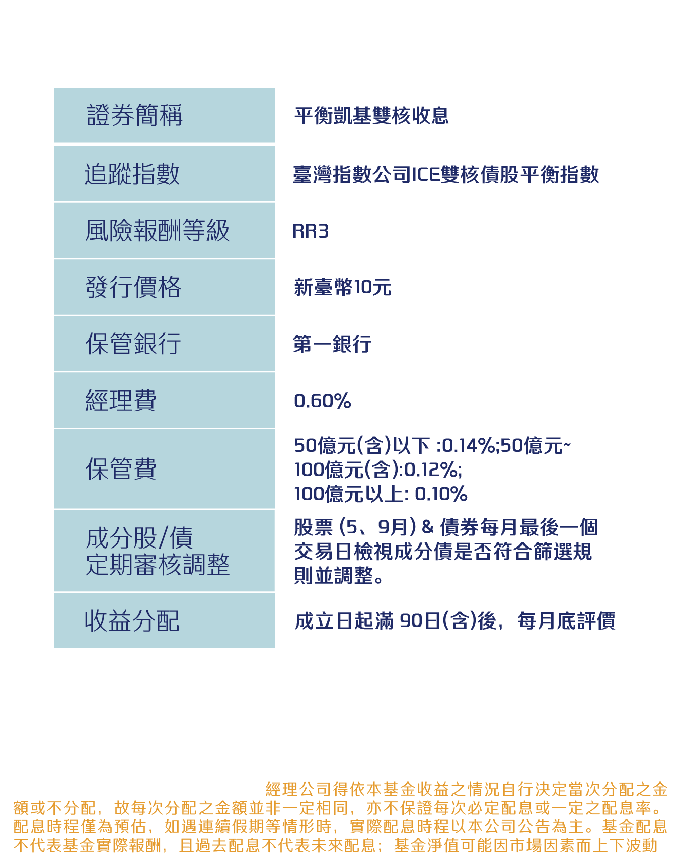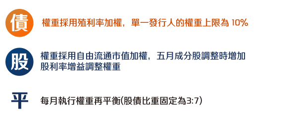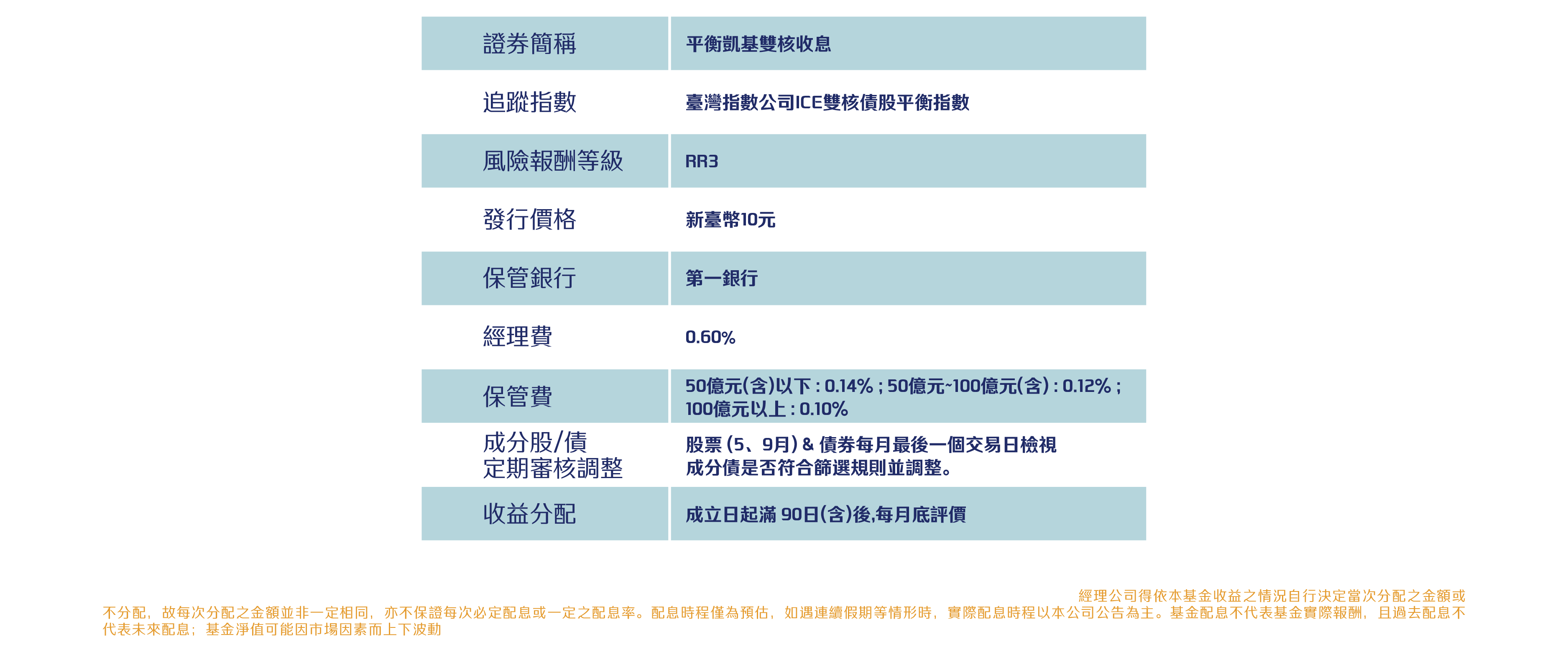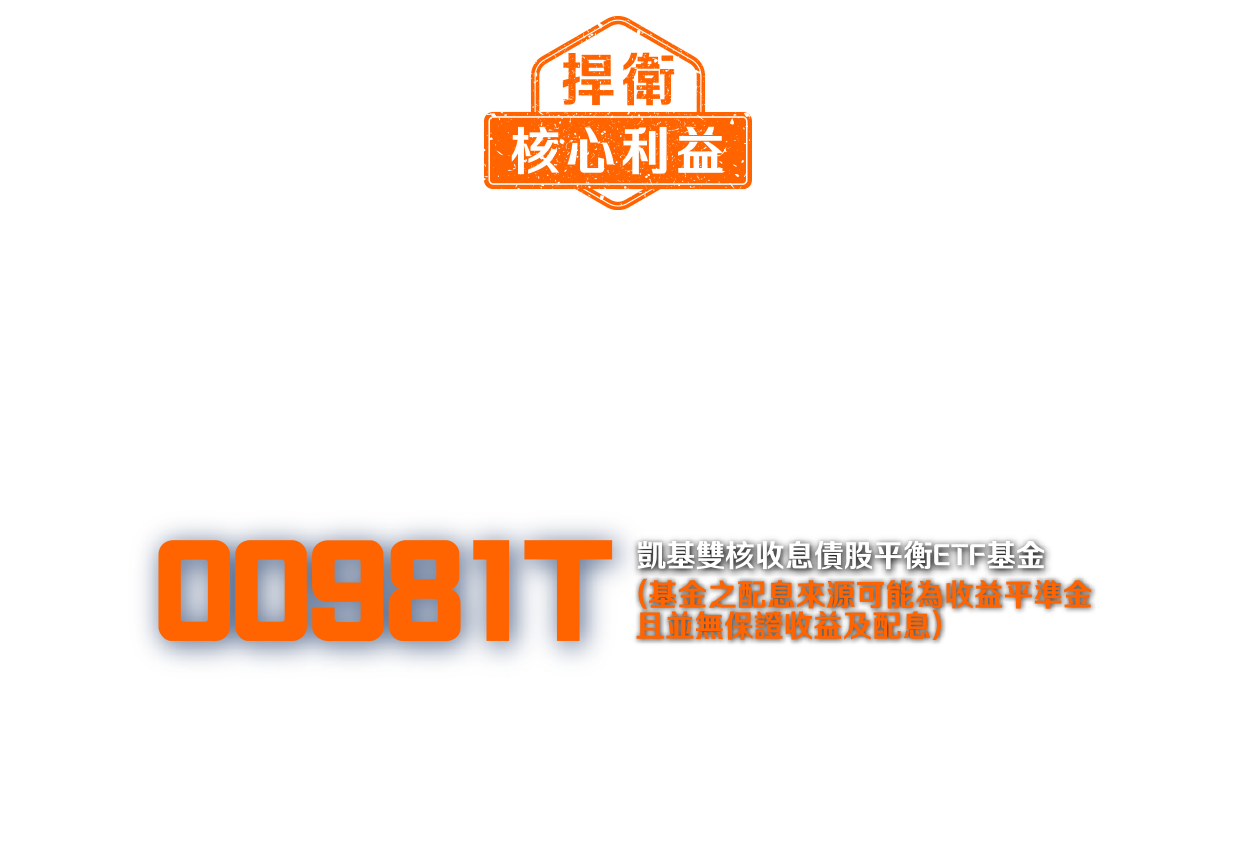 本資料係整理分析各方面資訊之結果,純屬參考性質,本公司不作任何保證或承諾,請勿將本內容視為對個別投資人做基金買賣或其他任何投資之建議或要約。本公司已力求其中資訊之正確與完整,惟不保證本報告絕對正確無誤。未經授權不得複製、修改或散發引用。風險報酬等級採用投信投顧公會「基金風險報酬等級分類標準」,風險報酬等級(RR)係計算過去5年基金淨值波動度標準差,以標準差區間予以分類等級RR1-RR5五級,數字越大代表風險越高,提醒投資人該等級分類係基於一般市場狀況反映市場價格波動風險,無法涵蓋所有風險(如:基金計價幣別匯率風險、投資標的產業風險、信用風險、利率風險、流動性風險等),不宜作為投資唯一依據,投資人仍應注意所投資基金其他個別的風險(如信用風險、流動性風險..等),投資人宜斟酌個人之風險承擔能力及資金之可運用期間長短後進行投資。「臺灣指數公司 ICE 雙核債股平衡指數」係由臺灣指數股份有限公司(臺灣指數公司)、ICE Data Indices, LLC (以上機構合稱「合作單位」)共同開發,並由臺灣指數公司單獨授權凱基證券投資信託股份有限公司使用。「合作單位」並未以任何方式贊助、背書、出售或促銷基金,且「合作單位」亦未明示或默示對使用指數之結果及/或指數於任一特定日期之任一特定時間或其他時間之數據提供任何保證或聲明。指數係由「合作單位」所計算。然「合作單位」就指數之任何錯誤、不正確、遺漏或指數資料之傳輸中斷對任何人均不負任何責任,且無任何義務將該等錯誤、不正確或遺漏通知任何人。