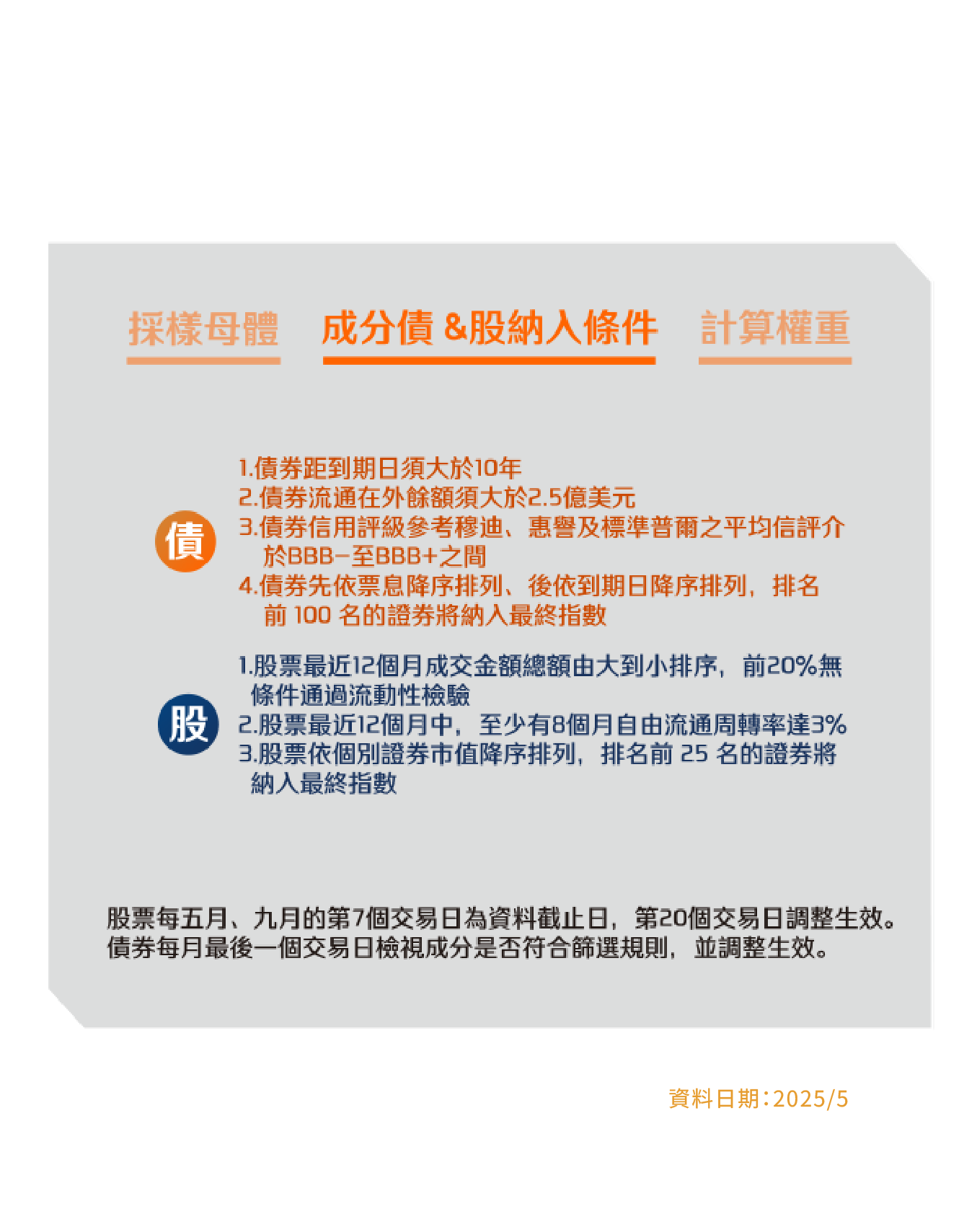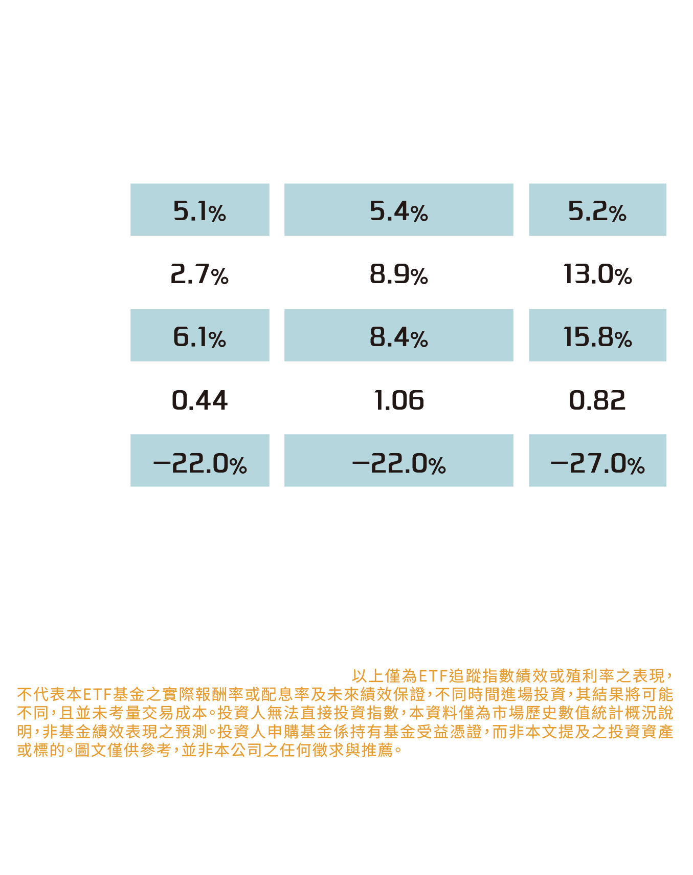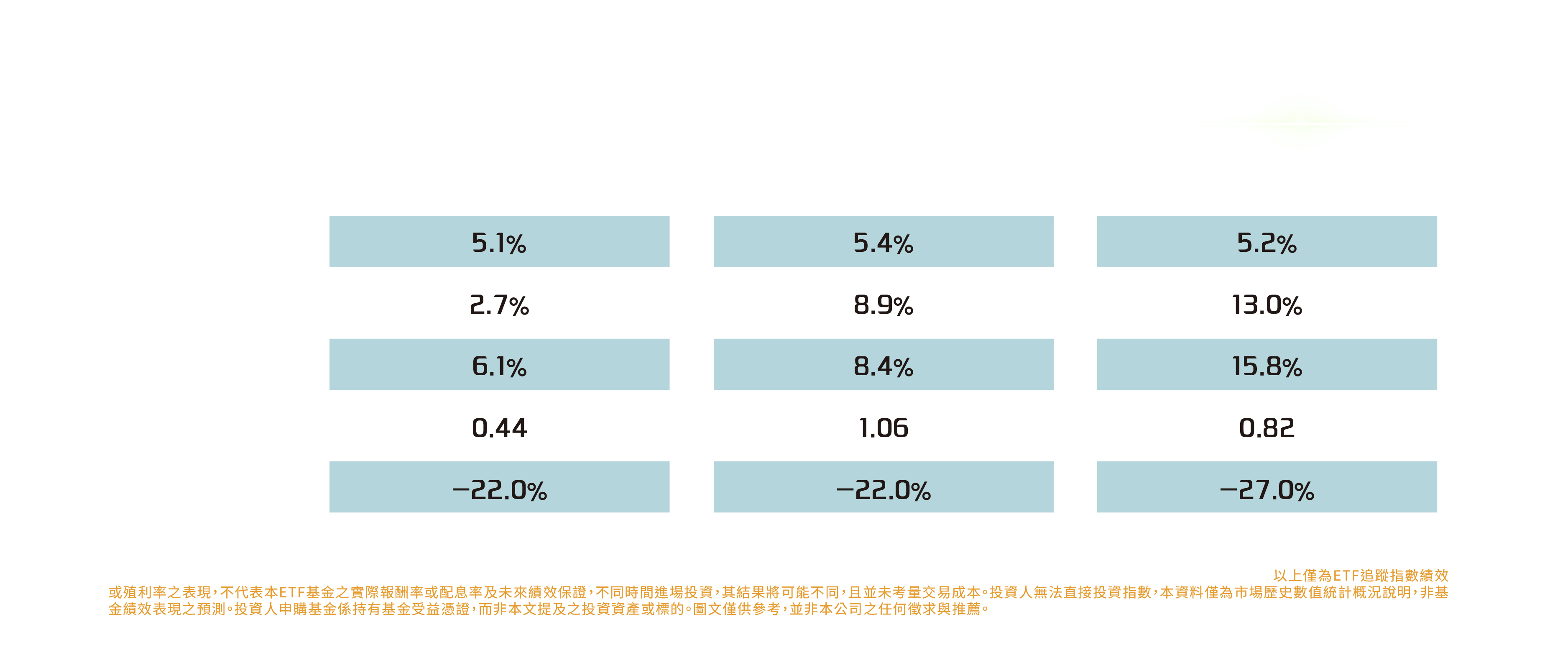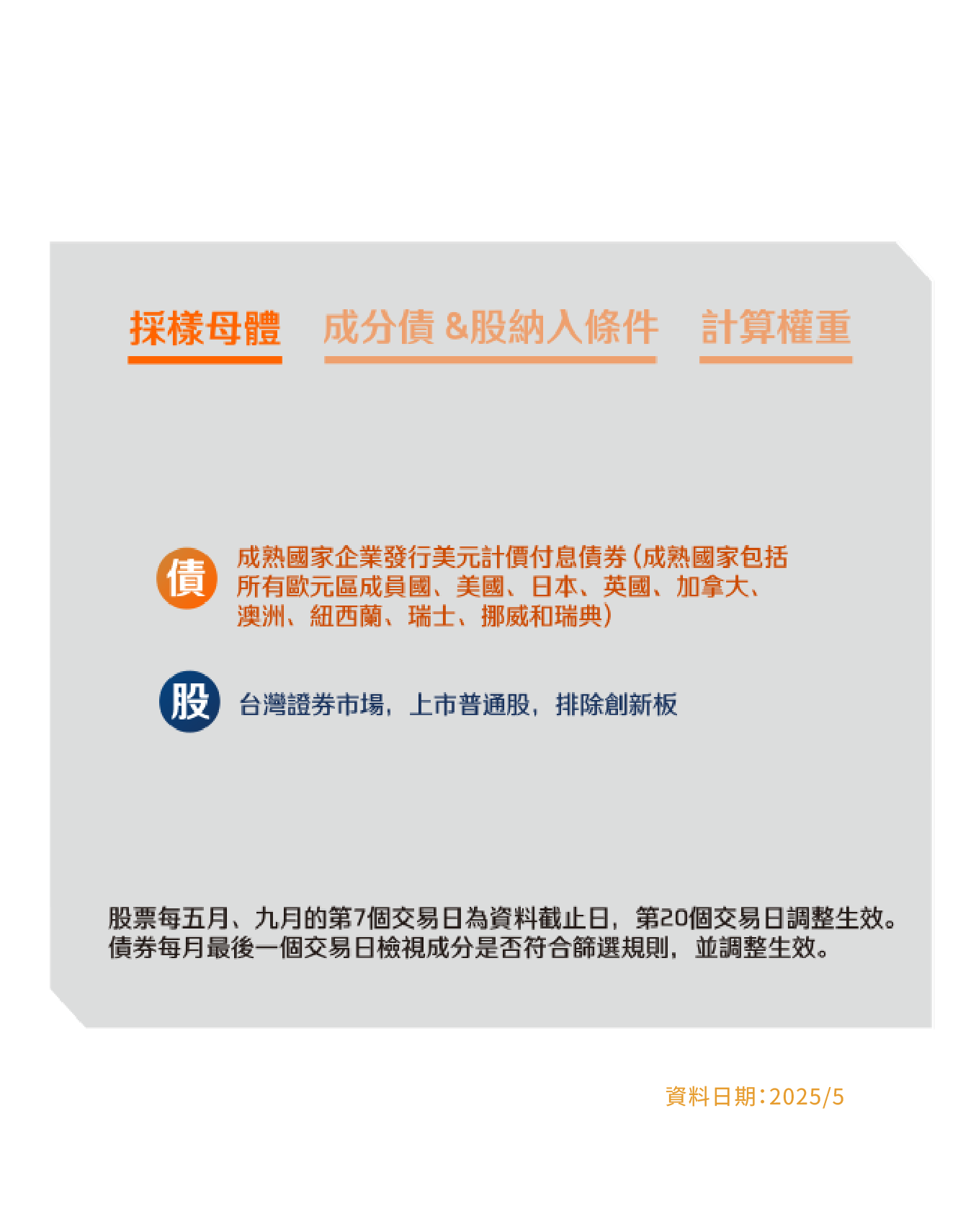 本資料係整理分析各方面資訊之結果,純屬參考性質,本公司不作任何保證或承諾,請勿將本內容視為對個別投資人做基金買賣或其他任何投資之建議或要約。本公司已力求其中資訊之正確與完整,惟不保證本報告絕對正確無誤。未經授權不得複製、修改或散發引用。風險報酬等級採用投信投顧公會「基金風險報酬等級分類標準」,風險報酬等級(RR)係計算過去5年基金淨值波動度標準差,以標準差區間予以分類等級RR1-RR5五級,數字越大代表風險越高,提醒投資人該等級分類係基於一般市場狀況反映市場價格波動風險,無法涵蓋所有風險(如:基金計價幣別匯率風險、投資標的產業風險、信用風險、利率風險、流動性風險等),不宜作為投資唯一依據,投資人仍應注意所投資基金其他個別的風險(如信用風險、流動性風險..等),投資人宜斟酌個人之風險承擔能力及資金之可運用期間長短後進行投資。「臺灣指數公司 ICE 雙核債股平衡指數」係由臺灣指數股份有限公司(臺灣指數公司)、ICE Data Indices, LLC (以上機構合稱「合作單位」)共同開發,並由臺灣指數公司單獨授權凱基證券投資信託股份有限公司使用。「合作單位」並未以任何方式贊助、背書、出售或促銷基金,且「合作單位」亦未明示或默示對使用指數之結果及/或指數於任一特定日期之任一特定時間或其他時間之數據提供任何保證或聲明。指數係由「合作單位」所計算。然「合作單位」就指數之任何錯誤、不正確、遺漏或指數資料之傳輸中斷對任何人均不負任何責任,且無任何義務將該等錯誤、不正確或遺漏通知任何人。